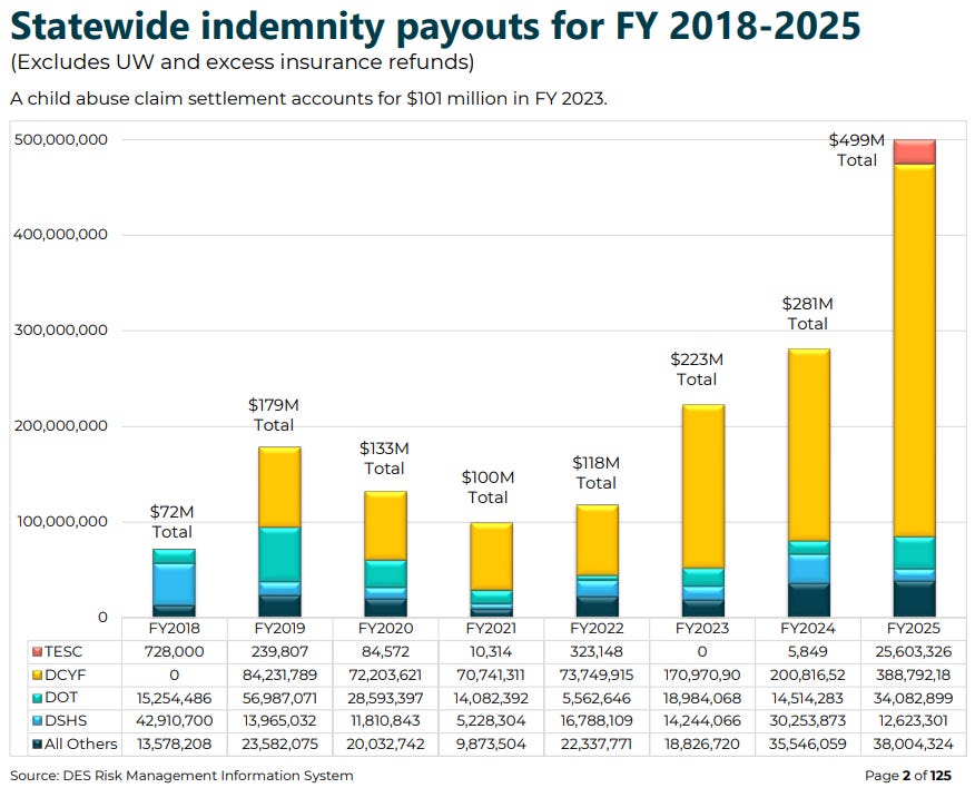 Quick background: The state (and other governments) are in this spot because a) public employees screwed up; b) WA, unlike other states, waived sovereign immunity eons ago; c) there’s been a series of state Supreme Court rulings and some legislation4 which expanded the type of cases that can be filed. The expansion particularly gave refuge to older (as old as the 1960s) claims of sexual abuse. In short, WA left itself exposed, and is reckoning with the extent of the sunburn.